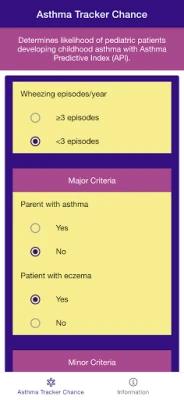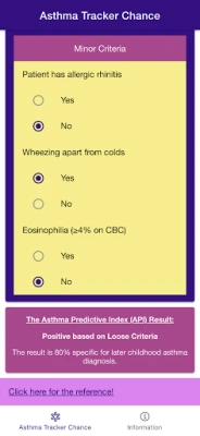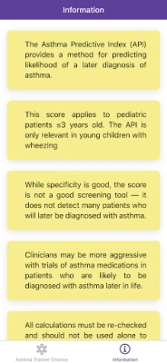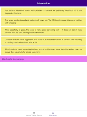 Disclaimer: all calculations must be re-checked and should not be used alone to guide patient care, nor should they substitute for clinical judgment. Calculations in "Asthma Tracker Chance - Asthma Predictive Index" app might be different with your local practice. Consult to expert doctor whenever necessary.