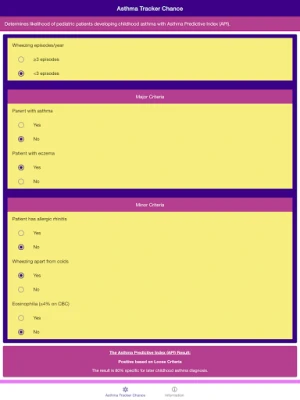 "Asthma Tracker Chance - Asthma Predictive Index" is a medical mobile app designed to help health practitioner or pediatrician to determine the chance of developing childhood asthma on patients aged less than 3 years old. "Asthma Tracker Chance - Asthma Predictive Index" app is based on both strict criteria and loose criteria. Strict criteria for asthma predictive index will be used for children with more than 3 wheezing episodes per year. While loose criteria will be used for children with wheezing episodes less than 3 per year.