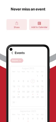 NEVER MISS AN EVENT The event section shows a list of events throughout the district. Users can add an event to their calendar and share the event with friends and family with one tap.