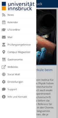 It includes complete access to LFU:online, the student portal of the University of Innsbruck, along with all exam results and an ECTS counter. In addition, the app offers a calendar with personal and public dates, research and study-relevant news about the university, a comprehensive campus guide to the university buildings and rooms with links to Google Maps and the menu plans of the university cafeterias. The integrated mail client gives you mobile access to your e-mail account at the university.